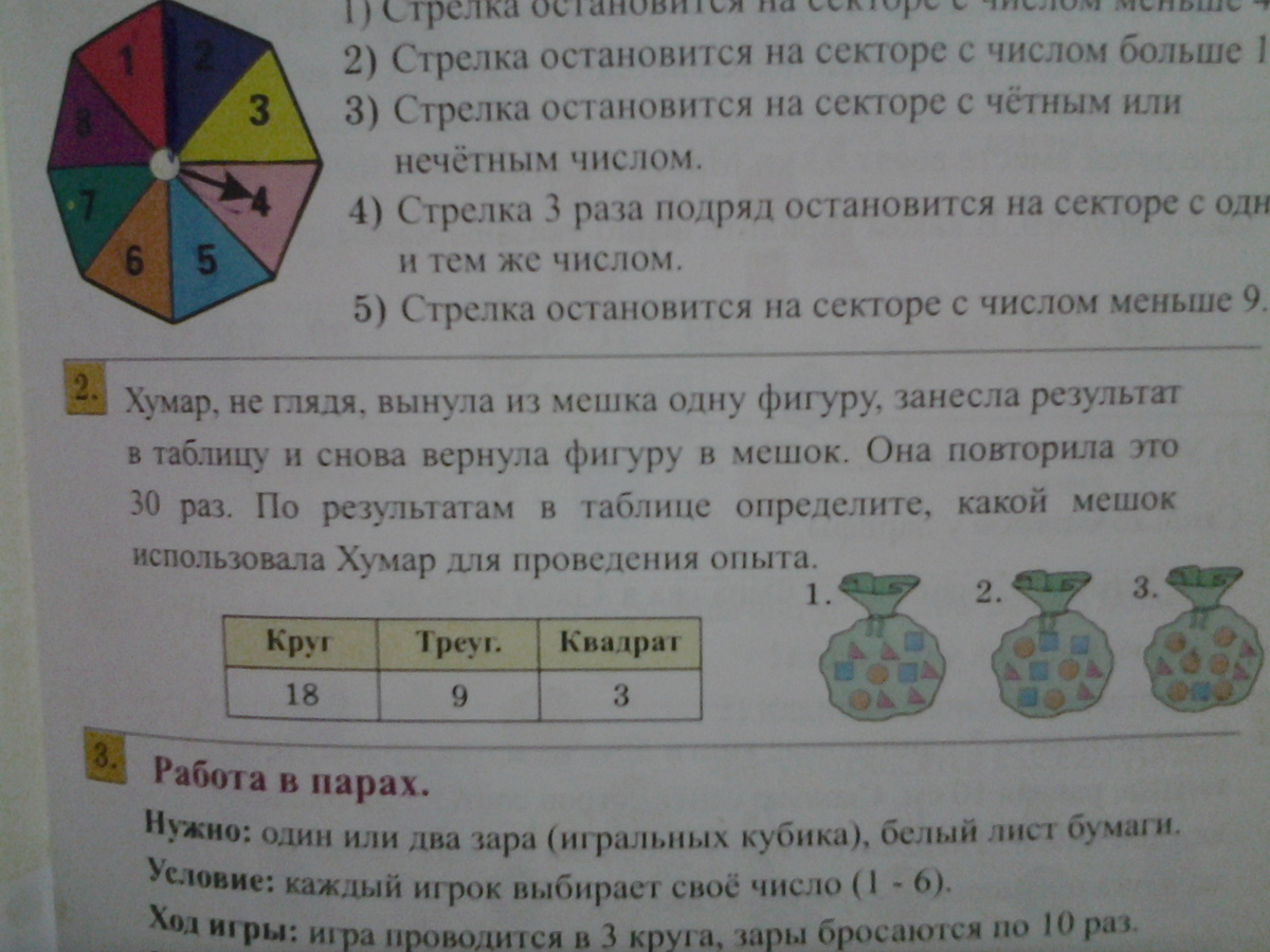 Самая правая картинка - правильный ответ , потому что в этом мешочке 6 кругов , что в 2 раза больше чем треугольников, а треугольников в 3 раза больше , чем крадратов , получается :