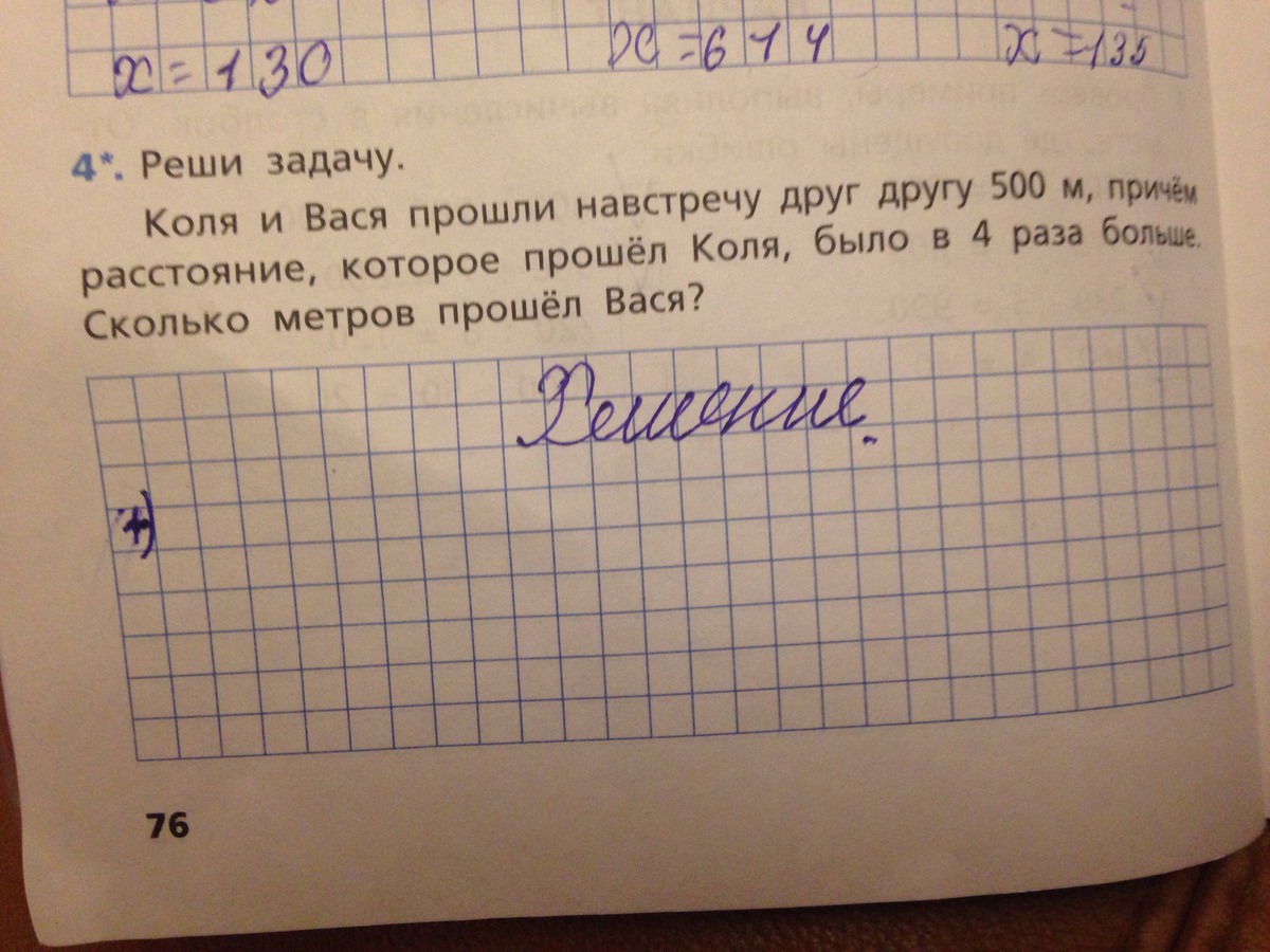 Коля и Вася прошли навстречу друг другу 500 м причем расстояние,которое прошёл Коля, было в 4 раза больше.Сколько метров прошёл Вася?