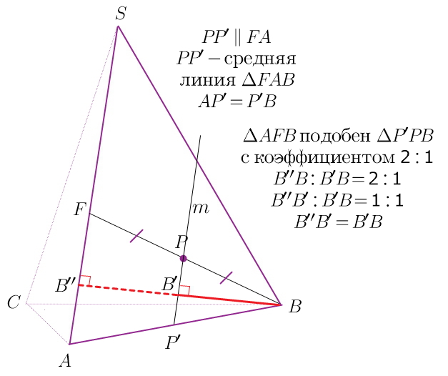 Тетраэдр SABC.Отрезок ВF - биссектриса треугольника АSB,точка Р - середина отрезка BF.Прямая m ,лежащая в плоскости грани SAB,проходит через точку Р и параллельна прямой АS.Докажите,что расстояние от точки В до прямой m равно расстоянию между прямыми m и АS. Пожалуйста!Срочно!