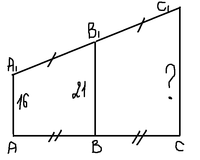 На одной прямой на равном расстоянии друг от друга стоят три телеграфных столба. Первый и второй столбы находятся от дороги на расстояниях 16 м и 21 м .Найдите расстояние (в метрах ),на котором находится от дороги третий столб.