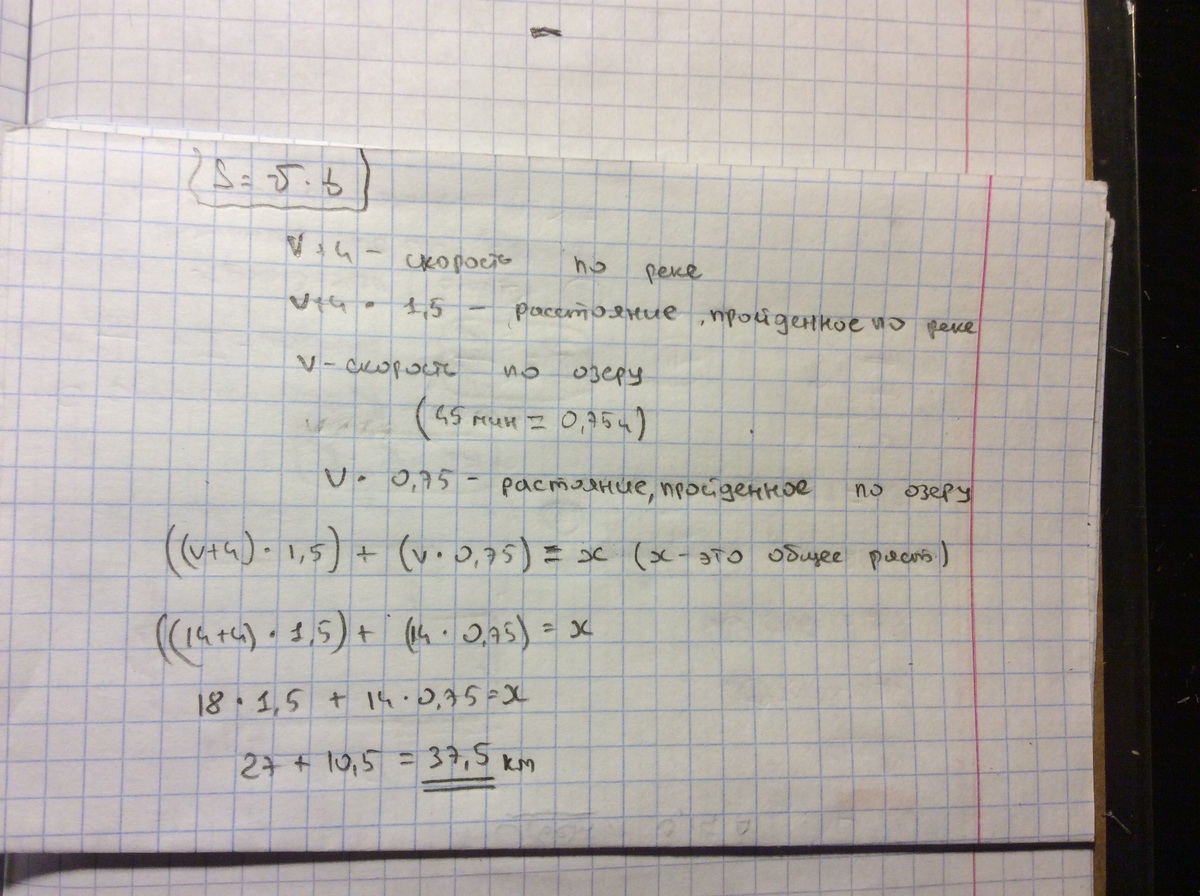 Катер проплыл 1.5 ч по реке, затем 45 мин по озеру, в которое впадает река. Собственная скорость катера v км/ч, а скорость течения реки 2 км/ч. Какое расстояние проплыл катер, если v=14?