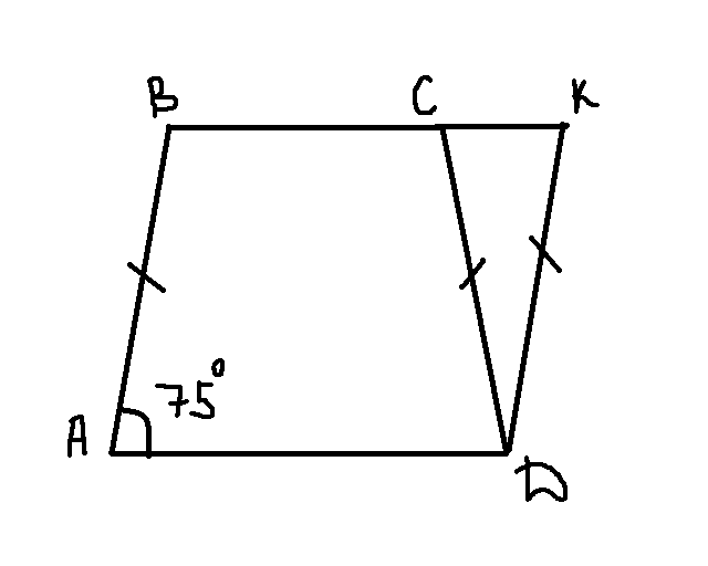 Угол А равнобедренной трапеции ABCD равен 75 градусов. Из точки D проведена прямая, которая пересекает прямую ВС в точке К, и CD=DK. Найдите угол CDK.