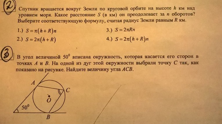 3. По определению Описанного угла, 0,5(∨ACB-∨AB)=50°. По определению окружности ∨ACB+∨AB=360°. ⇒ ∨AB=360°-∨ACB-50 и ∨ACB=360°-∨AB+50. ⇒ ∨AB=130. Проверяем 0,5(230-130)=50.