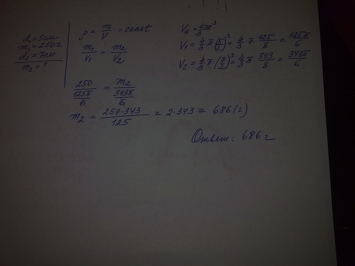 однородный шар диаметром 5 см имеет массу 250 гр чему равна масса шара , изготовленного из того же материала с диаметром 7 см?