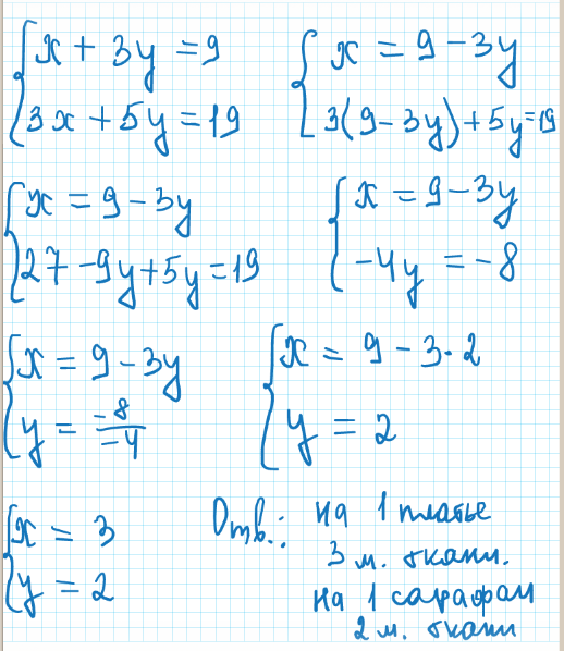 зная, что на три платья и пять таких же сарафанов ушло 19 м ткани составим второе уравнение системы: 3х+5у=19