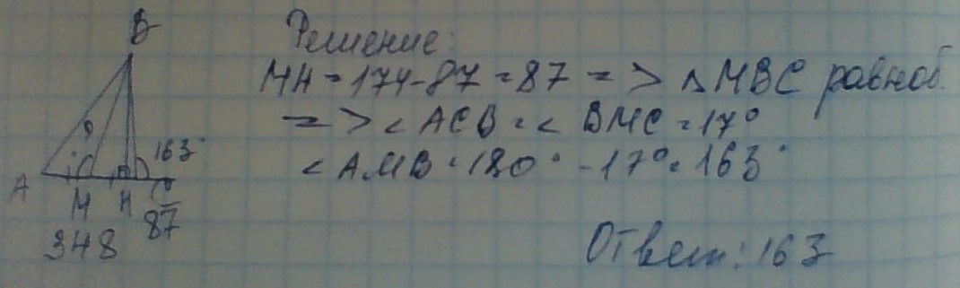 в треугольнике ABC BM-медиана и BH-высота. известно, что AC =348, HC =87 и угол ACB=17 градусов. Найдите угол AMB. Ответ дайте в градусах.