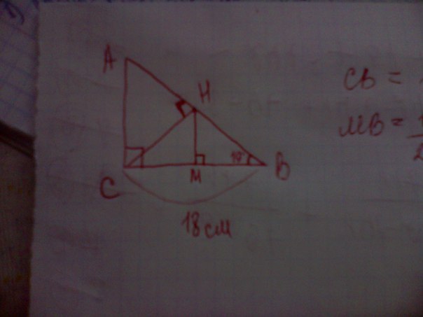 в прямоугольном треугольнике ABC угол С=90 градусов,угол B=19 градусов,BC=18 см,CН перпендикулярно АВ,НМ перпендикулярно BC.Найти MB.