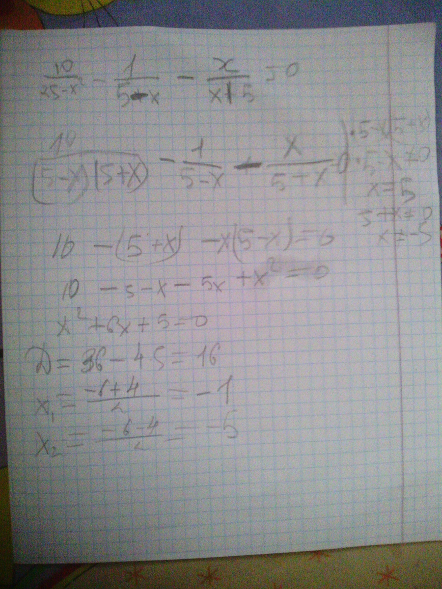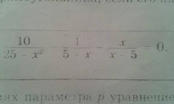 Неохота все подробно расписывать. Нужно привести к общему знаменателю 25-x^2, сложить числители, привести подобные, приравнять числитель полученной дроби к 0. Получатся два корня x=-1 и x=-5, но второй корень не входит в О.Д,З, Значит, решение - x=-1.