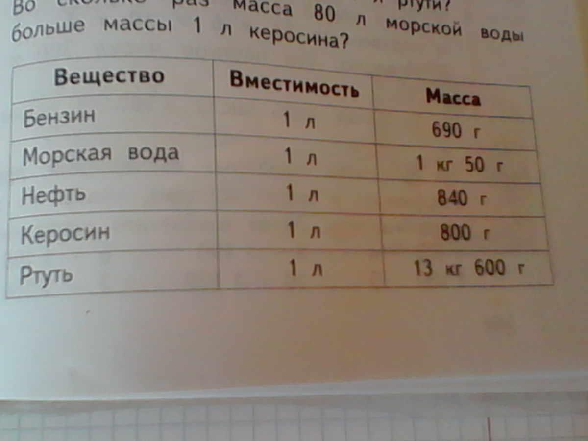 во сколько раз масса 80 л морской воды больше массы 1 л керосина?