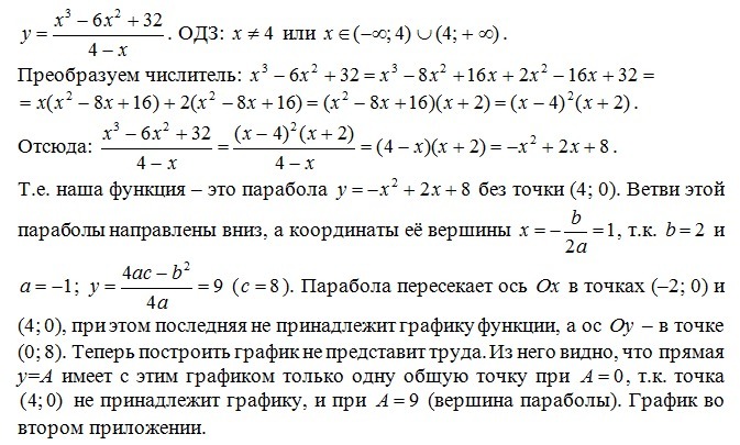 Построить график функции y=x^3-6x^2+32/4-x и определить при каких значениях А прямая у=А имеет с этим графиком только одну общую точку.