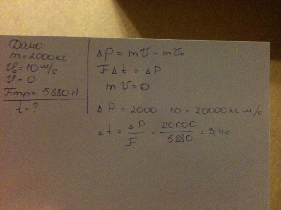 Автомобиль массой 2т движется со скоростью 36км/ч.Какое время требуется до полной остановки автомобиля при выключенном двигателе,если сила трения колес о дорогу равна 5 880Н?