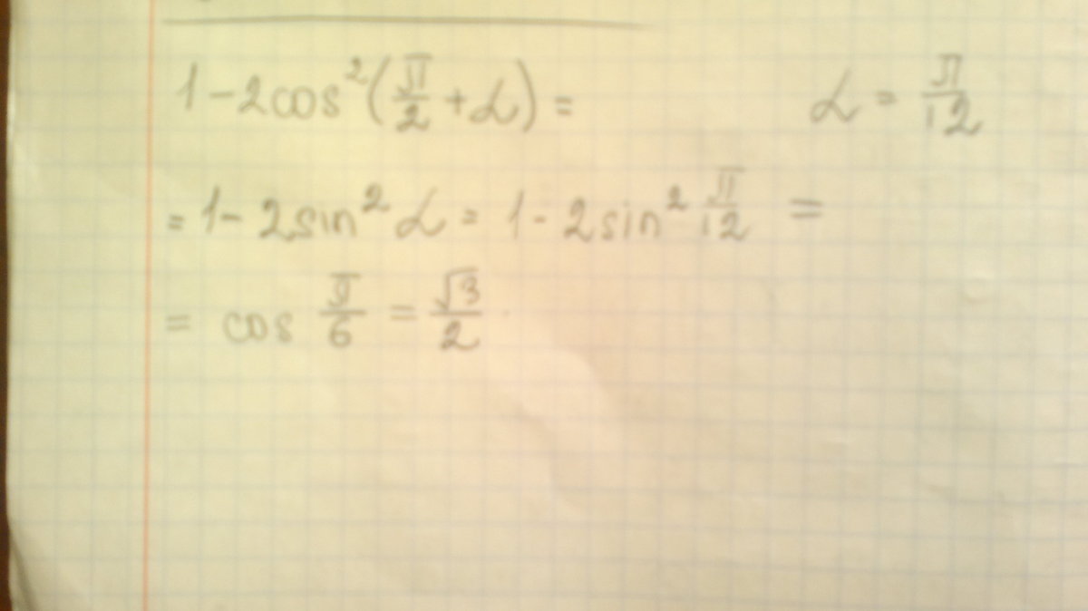 1-2sin^2a=1-2sin^2(p/12)=sin^2(p/12)+cos^2(p/12)-2sin^2(p/12)=cos^2(p/12)-sin^2(p/12=cosp/6=sqrt3/2