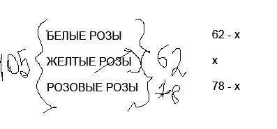 Праздничный торт был украшен розочками из крема. Всего на торте было 105 белых желтых и розовых розочек. Белых и жёлтых было 62 розочки жёлтых и розовых 78 р. Сколько розочек каждого цвета украшало торт?