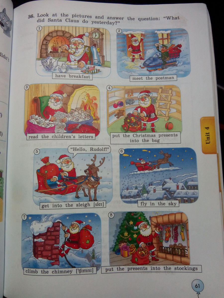 Yesterday Santa had a breakfast, met the postman,red the children's letters, put the Cristmas presents into the bag, got into the sleigh, flew in the sky, climbed the chimney, put the presents into the stockings.