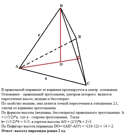 В правильной пирамиде ее вершина проецируется в центр основания. Основание - правильный треугольник, центром которого является пересечение высот, медиан и биссектрис. По свойству медиан, они делятся точкой пересечения в отношении 2:1, считая от вершины треугольника. По формуле высоты (медианы, биссектрисы) правильного треугольника: h = (√3/2)*a, где а - сторона треугольника. Тогда h=(3/2)*6 = 3√3, а отрезок высоты АО = (2/3)*h = 2√3. По Пифагору высота пирамиды DO=√(AD²-AO²) = √(16-12) = √4 = 2.