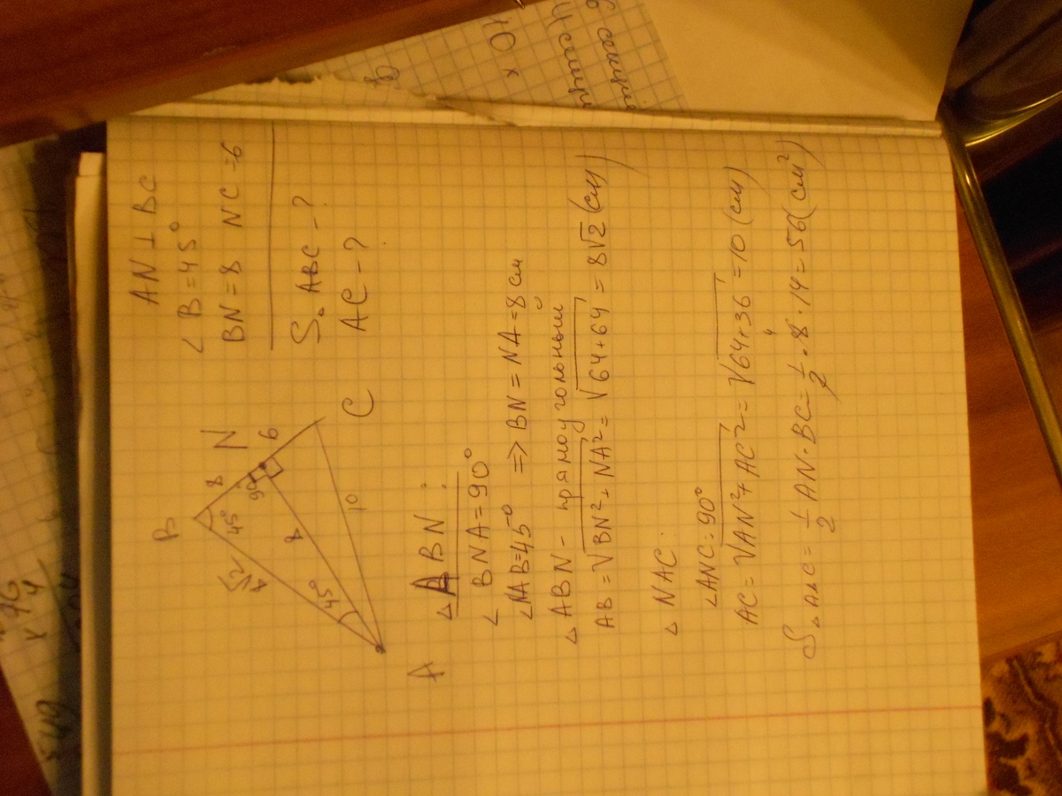 в треугольнике ABC угол B равен 45 градусов высота AN делит сторону BC на отрезки BN равную 8 см и NC равную 6 см найдите площадь треугольника ABC и сторону AC