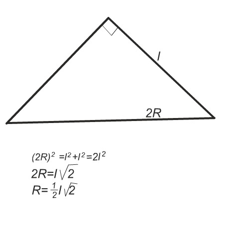 D=l √2 или иначе 2R= l √2, а R= ½ l √2