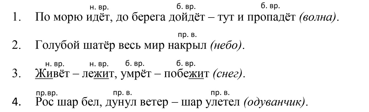 1 по морю идёт до берега дойдёт тут и пропадёт волна. 2 голубой шатёр весь мир накрыл небо. 3 живёт - лежит умрёт-побежит снег. 4 рос шар бел дунул ветер - шар улетел одуванчик. укажите над глаголами время подчеркните в словах 3-го предложения изученные орфограммы .
