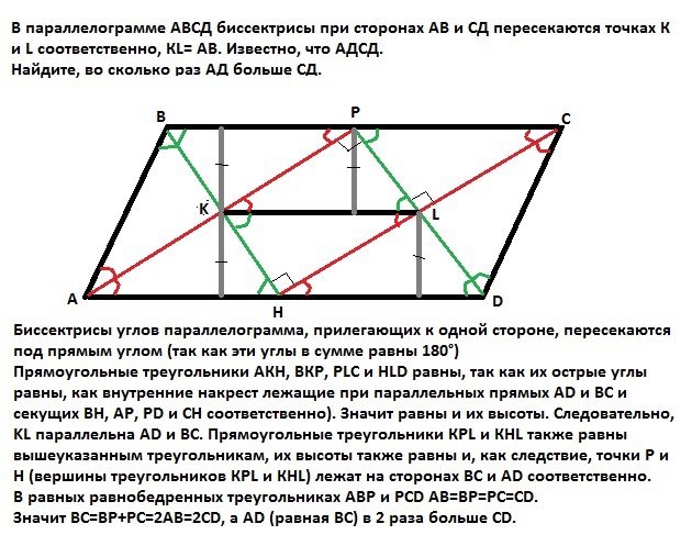 В параллелограмме АВСД биссектрисы при сторонах АВ и СД пересекаются точках К и L соответственно, КL= АВ. Известно, что АД > СД. Найдите, во сколько раз АД больше СД.