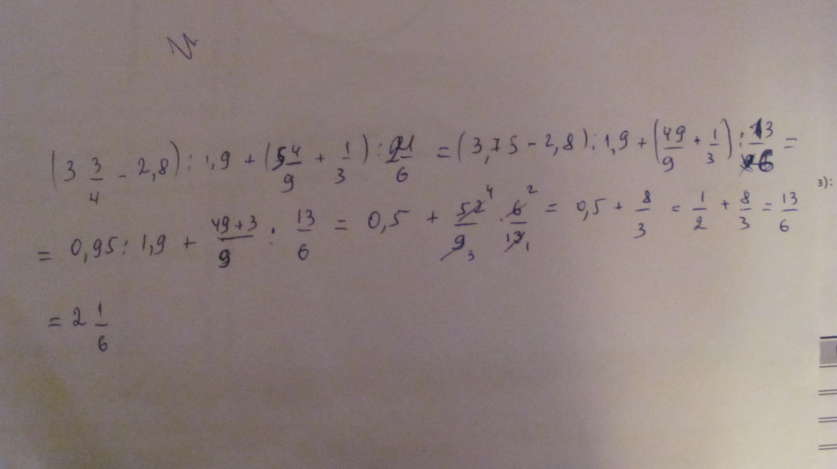 (3 3\4 - 2.8) : 1.9 + (5 4\9+ 1\3) : 2 1\6=2 1/6 проверить!