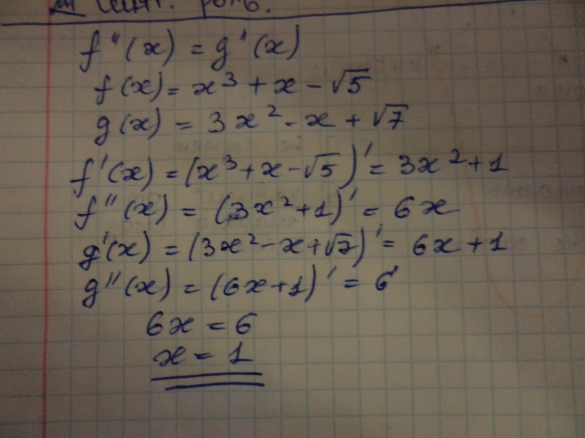Решите неравенство f"(x)=g"(x) если f(x)=x^3+x-корень из 5 и g(x)=3x^2-x+корень из 7