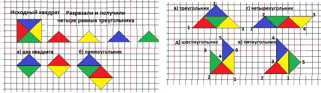 возьмите квадрат и проведите его диагонали разрежьте квадрат по диагоналям какие фигуры вы получили? равны ли они? сложите из частей квадрата следующие фигуры и зарисуйте их а) два квадрата б) прямоугольник в) треугольник г) четырехугольник не являющийся прямоугольником д) шестиугольник