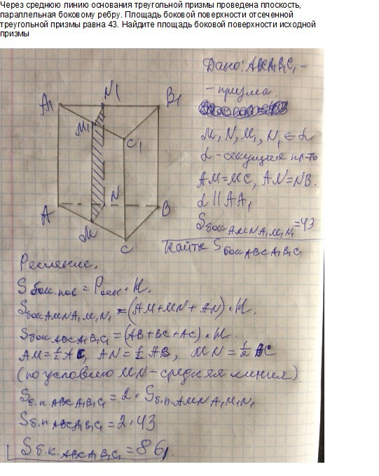 Через среднюю линию основания треугольной призмы проведена плоскость, параллельная боковому ребру. Площадь боковой поверхности отсеченной треугольной призмы равна 43. Найдите площадь боковой поверхности исходной призмы.