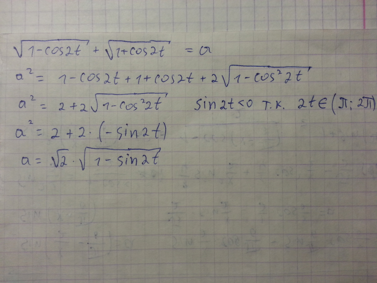 Обозначим sqrt(1-cos2t)+sqrt(1+cos2t) =а.