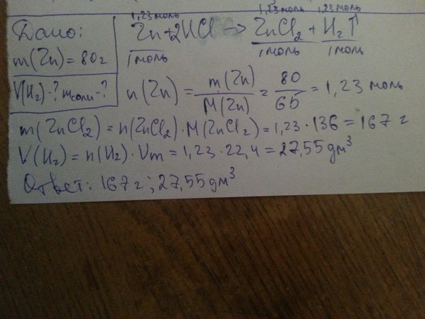 n(Zn) = m/M. n(Zn)=80/65=1.2 моль