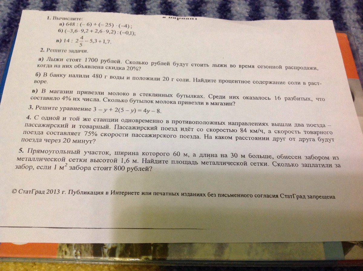 5) 1) 60+30=90 м - длина участка2) 2(60+90) = 300 м - периметр участка или длина всего забора3) 300* 1,6 = 480 кв.м - площадь всего забора4) 480*800= 384 000 рублей - стоимость забораОтвет 480 кв.м - площадь забора; 384 000 рублей - заплатили за забор