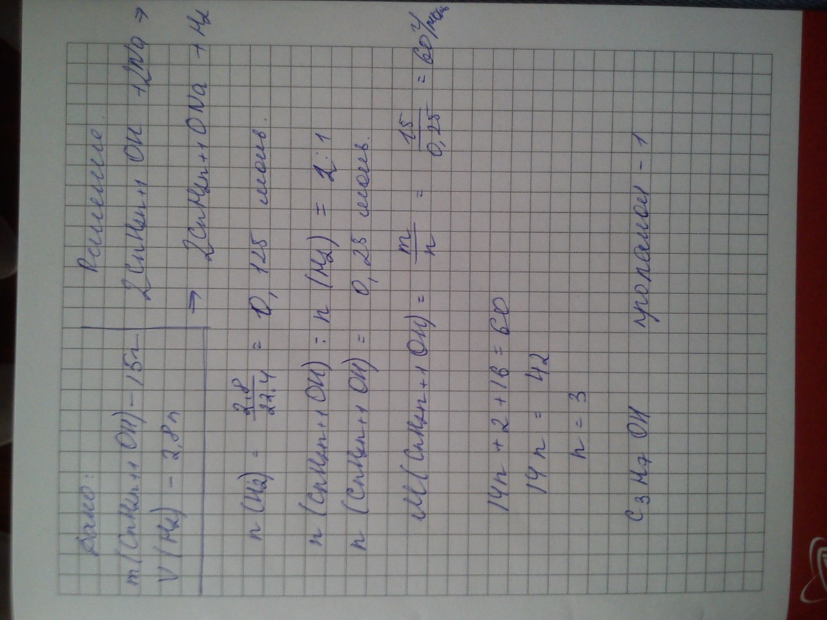 предельный одноатомный спирт массой 15г прореагировал с металлическим натрия. при етом выделился водород,обьём которого составил 2,8 л,определите формулу спиртв и нвзовите его