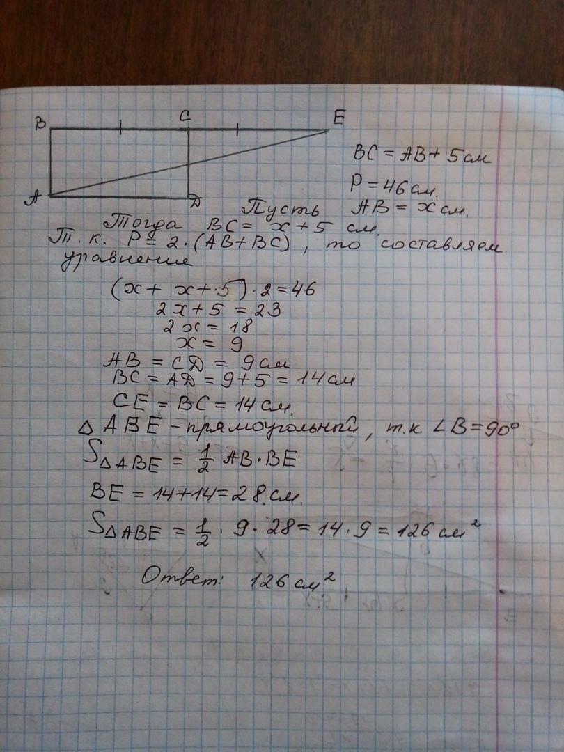 Через вершину А прямоугольника ABCD проведена прямая, пересекающая продолжение стороны BC в точке E так, что BC=CE.Периметр прямоугольника равен 46см, а сторона BC на 5 см больше AB. Найдите площадь треугольника ABE.