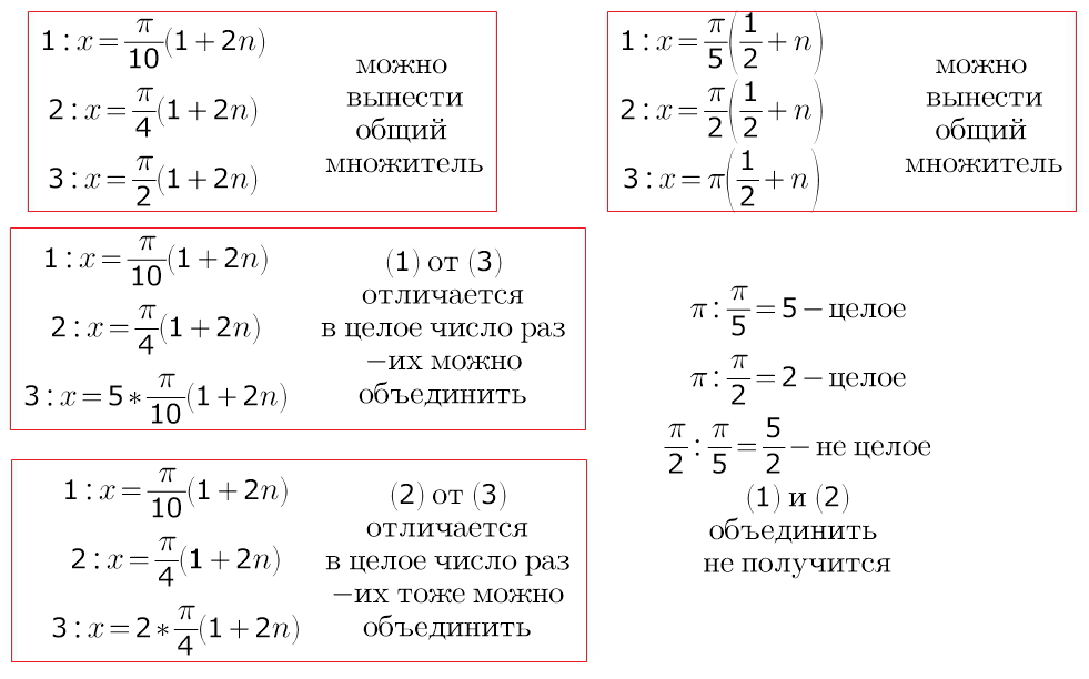 Я делаю так: 1) выношу общий множитель двух выражений pi/5(1/2+n) и pi(1/2+n). 2) общий знаменатель pi/5 и pi содержится в первом ( pi/5), поэтому их объединение будет pi/5(1/2+n). Правильно ли?