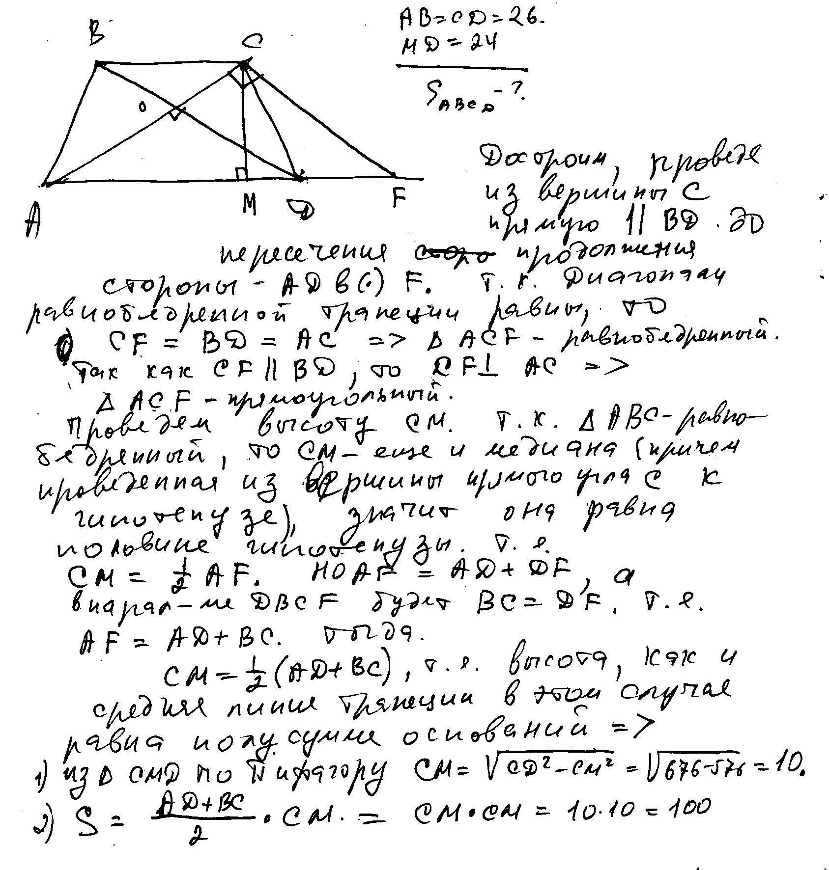 в равнобедренной трапеции со взаимно перпендикулярными диагоналями боковая сторона равна 26 см.Высота,проведенная из вершины тупого угла,делит большее основание на отрезки,меньший из которых равен 24 см.Найдите площадь трапеции.