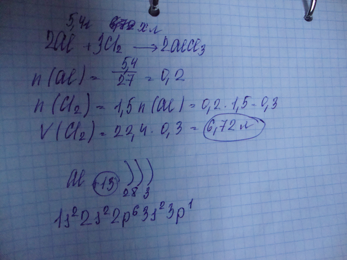 В реакцию с элементом главной подгруппы III группы массой 5,4 г полностью прореагировал хлор объемом 6,72 л (н.у.).Найдите этот элемент.Составьте схему строения атома,электронную формулу.