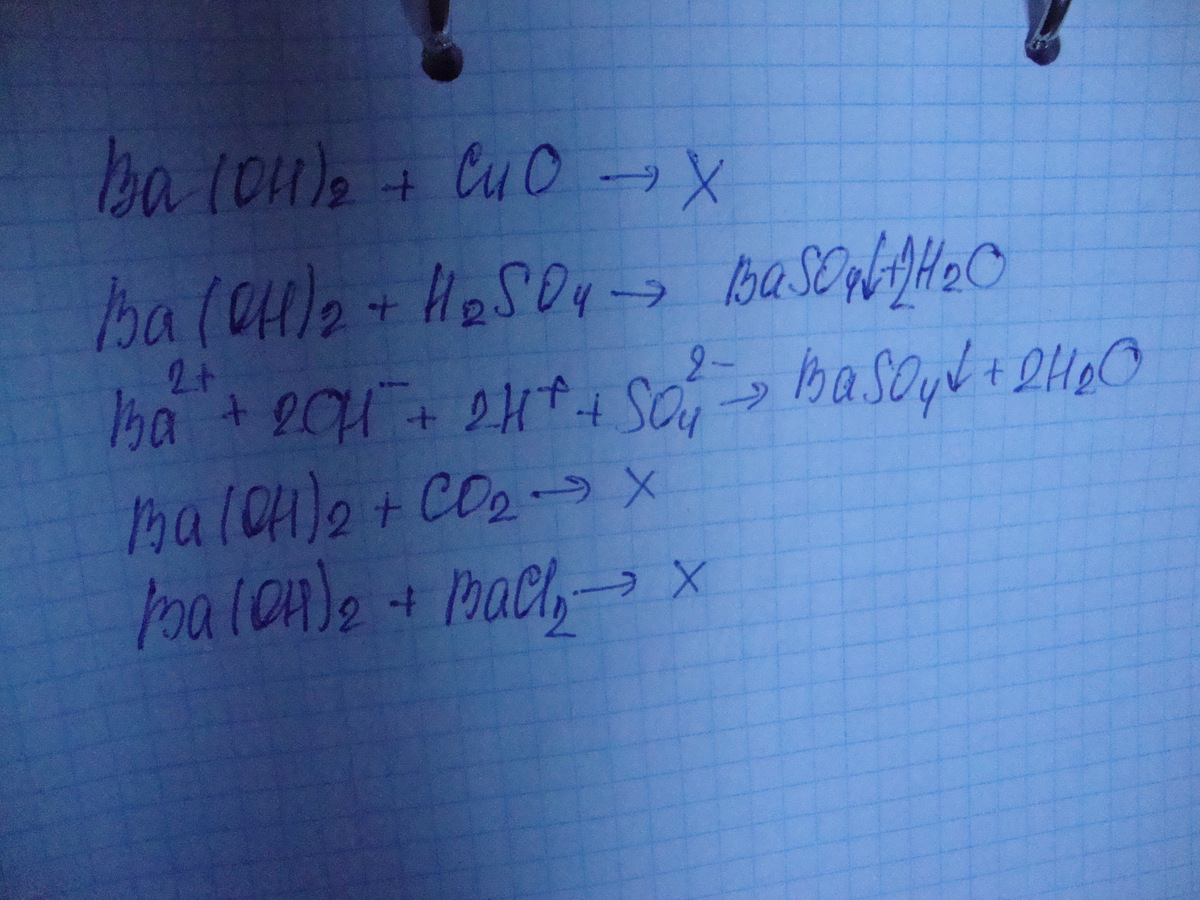 С какими из перечисленных веществ ступает в реакцию раствор гидроксида бария:оксид меди 2,серная кислота,оксид углерода 4,хлорид натрия?Составьте