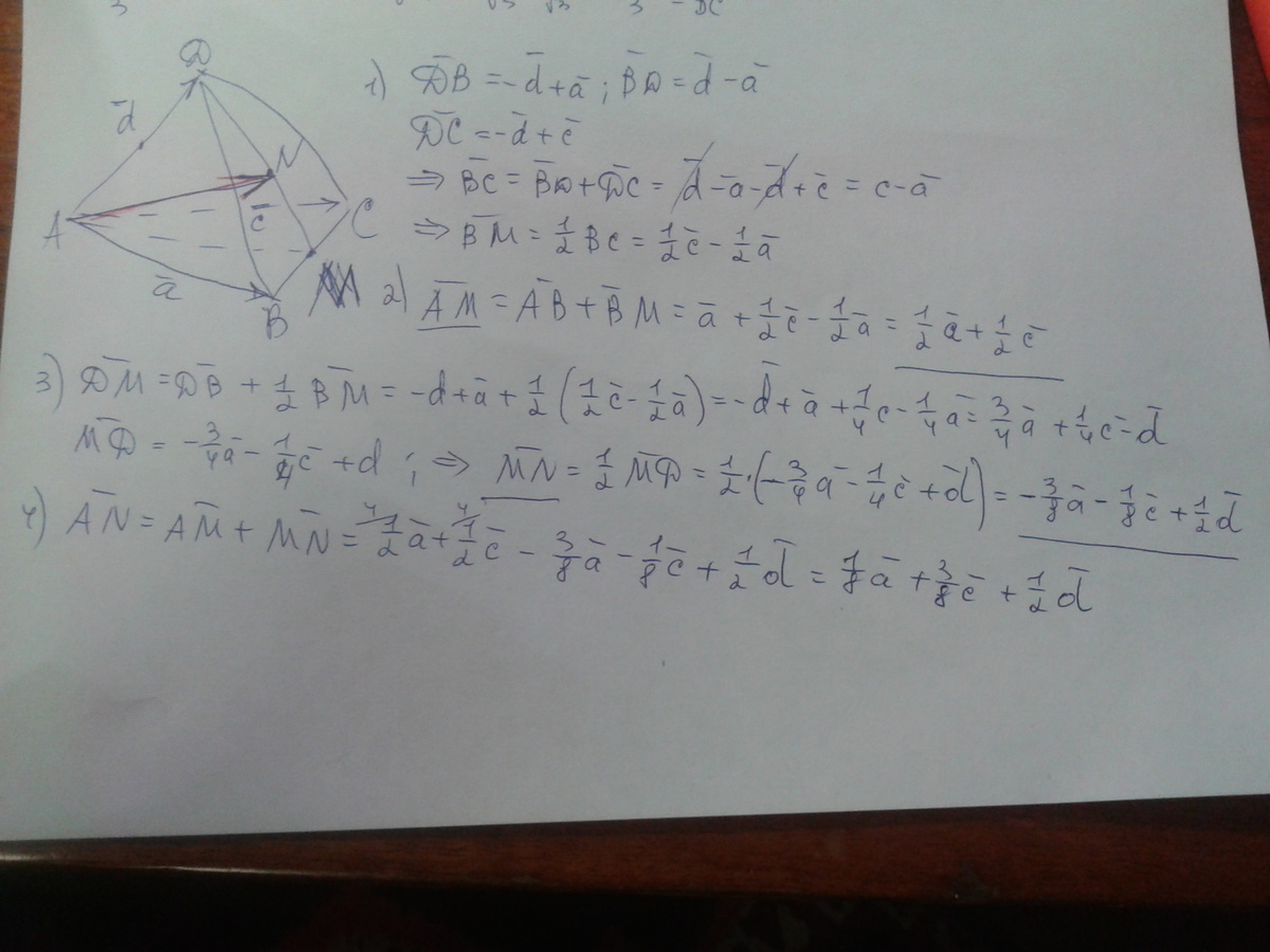 Точка М -середина ребра ВС тетраэдра DABC,точка N - середина отрезка DМ. Выразите вектор АN через векторы АВ = а , АС = с ,АД = д
