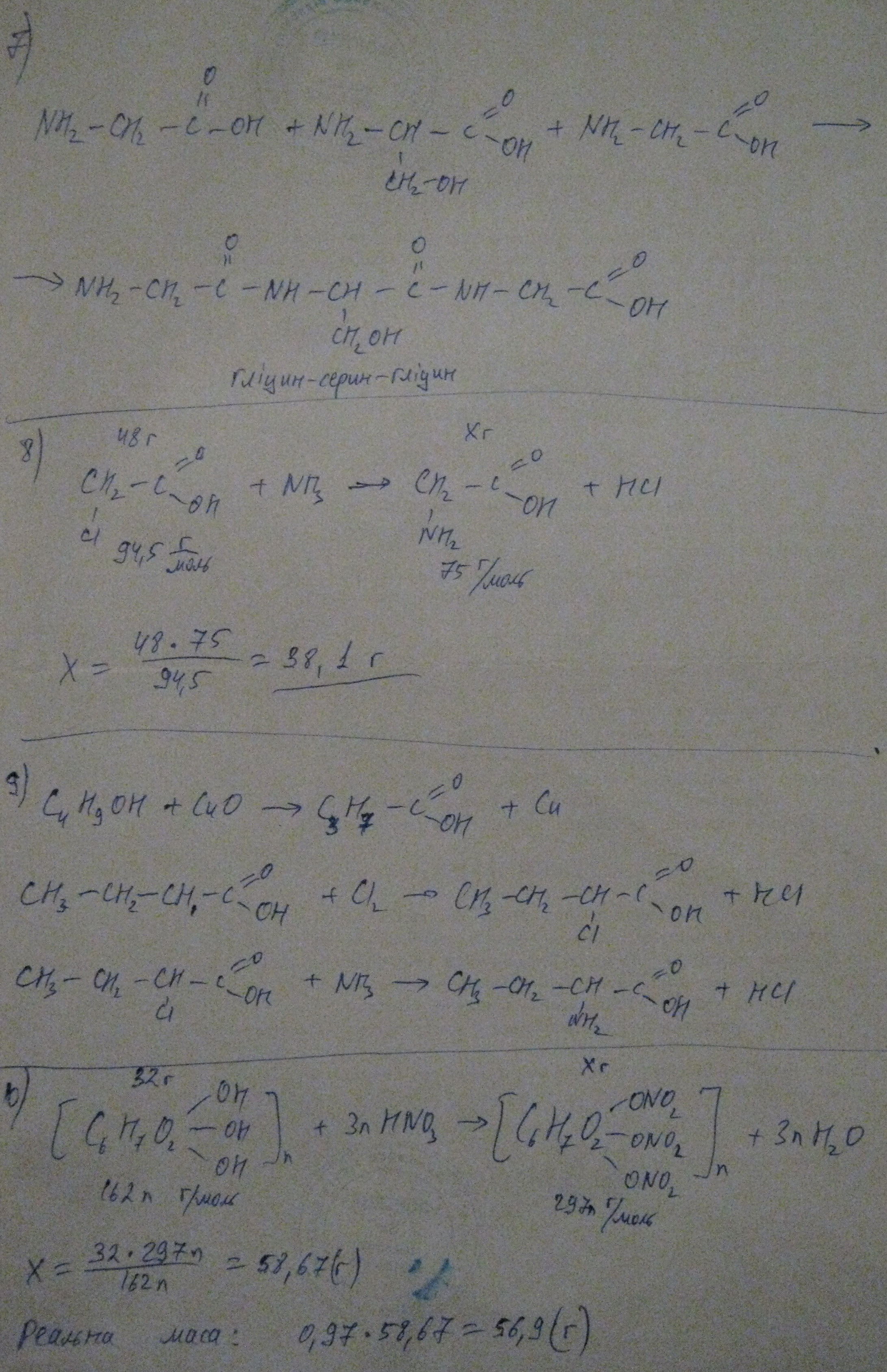 7. Напишіть рівняння утворення трипептиду з двох молекул гліцину й молекули серину.