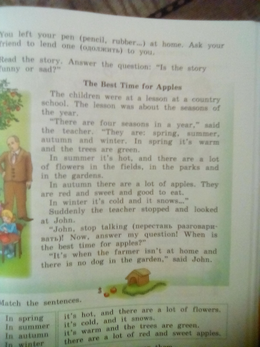 "Есть 4 сезона в году"-сказал учитель."Это весна,лето,осень,зима.Весной тепло и деревья зеленные.Летом жарко,и есть много цветов в полях,парках и в садах.