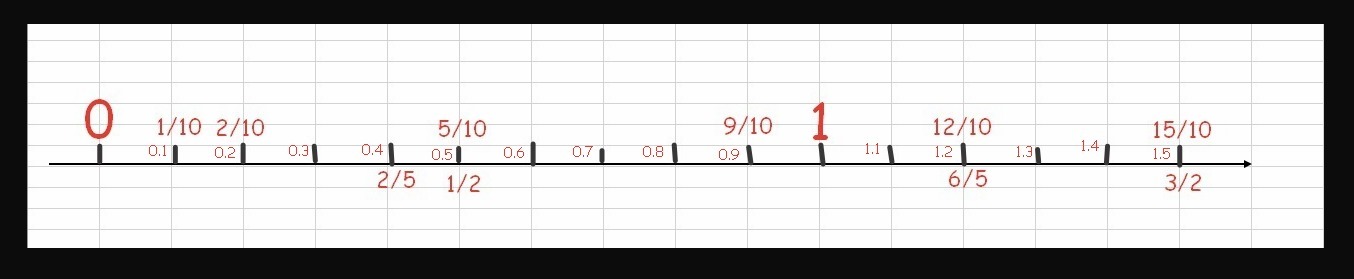 Начертите координатную прямую с единичным отрезком, равным 10 клеткам, и отметьте на ей точки с координатами 1\10, 2\10, 5\10, 9\10,12\10( ну эта типа 1 1\10), 15\10( эта типа 1 5\10,