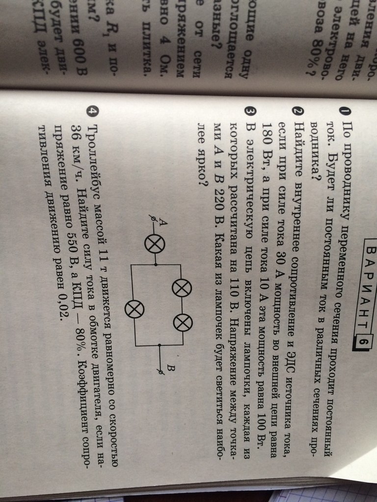 В электрическую цепь включены лампочки, каждая из которых рассчитана на 110 В. Напряжение между точками А и В 220 В. Какая из лампочек будет светиться наиболее ярко?