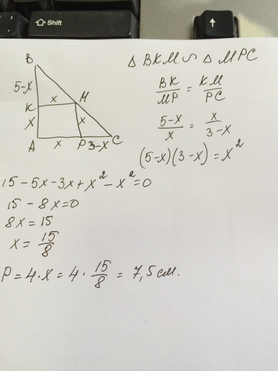 в прямоугольный треугольник с катетами 3 и 5 вписан квадрат, имеющий с треугольником общий прямой угол. найти периметр квадрата. ответ записать в виде десятичной дроби.