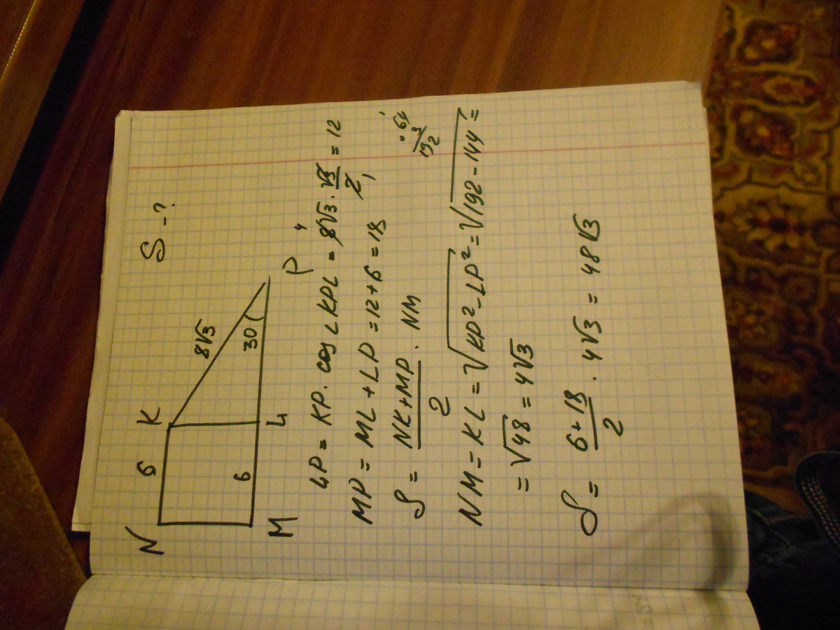 острый угол P прямоугольный трапеции MNKP равен 30 . большая боковая сторона равна 8 карней из 3 см а меньшее основание трапеции равен 6 найдите площадь трапеции