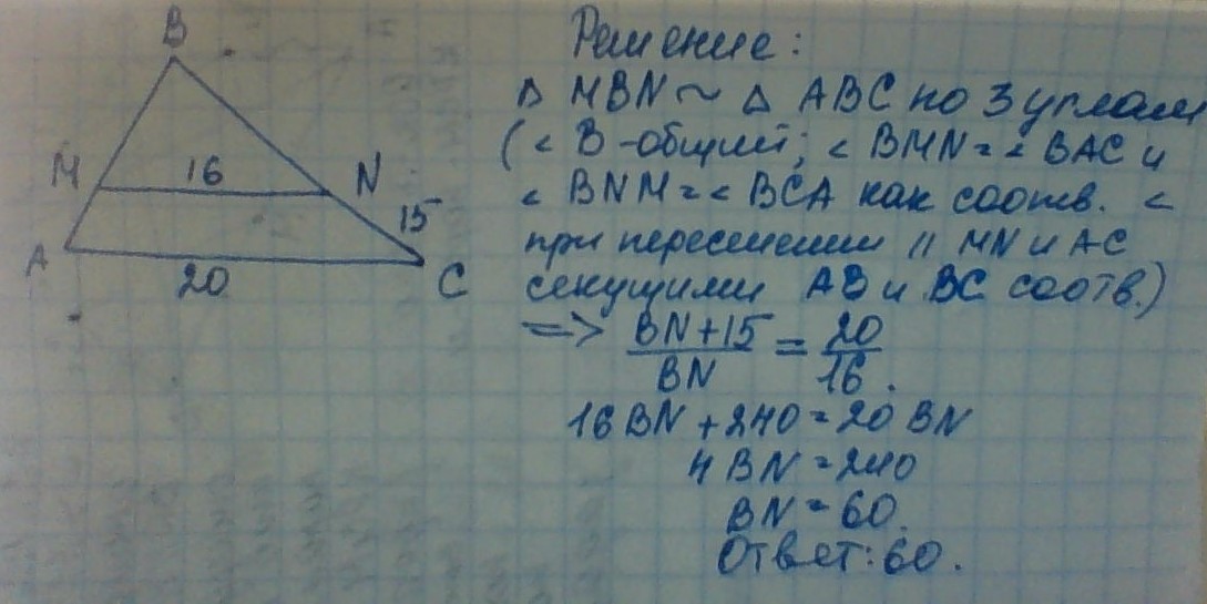 прямая, параллельная стороне АС треугольника АВС, пересекает стороны АВ и ВС в точках М и N соответственно. найдите BN, если MN=16, AC=20, NC=15