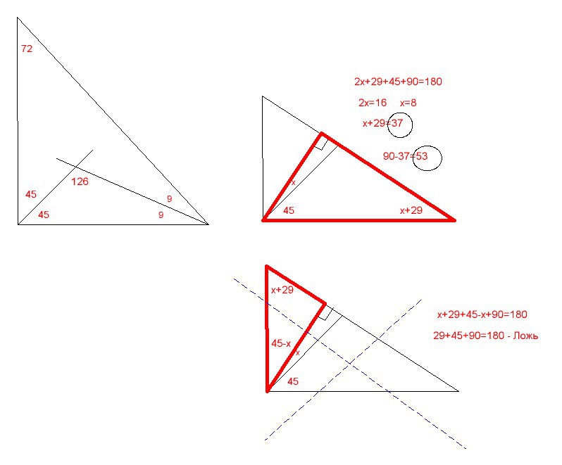 1. Биссектрисы острого и прямоугольного треугольника при пересечении образуют углы, один из которых равен 126°. Найдите острые углы треугольника.
