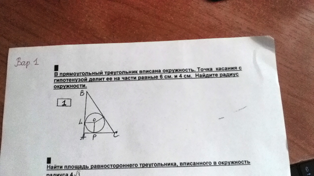 из каждой точки до касания с окружностью идут два одинаковых отрезка касательных, например из В идут отрезки BL и ВК ( пусть на гипотенузе будет К), они равны, оба по 6 см. Тогда из т С идут два отрезка СР = 4 и СК = 4 . Так же отрезки из т А тоже равны, но они нам не известны. Длина этих отрезкоа совпадает с длиной радиуса ( из квадрата ALOP ). Назовём отрезки АР и АL за Х, тогда вся сторона АВ будет 6 + Х ..... АС будет 4 + Х ....ВС= 10 и по т Пифагора