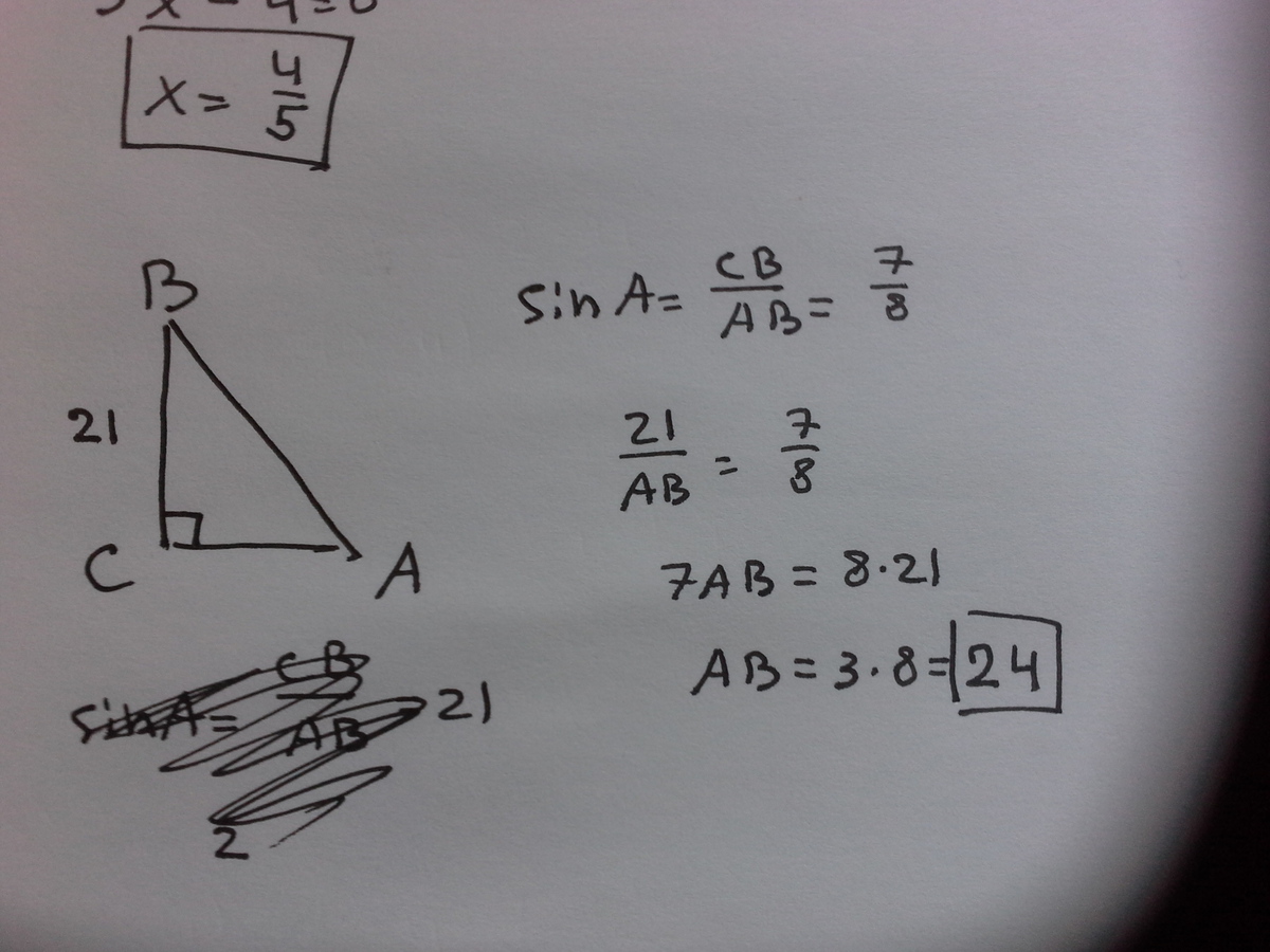 2) подставим данные значения в ...1,получим:7/8=21/АВ,