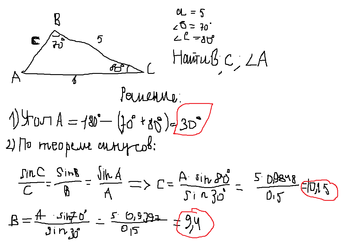 сторона а=(b*sin80)/sin70 b=a*sin70/sin80=5*0,9397/0,9848=4,8