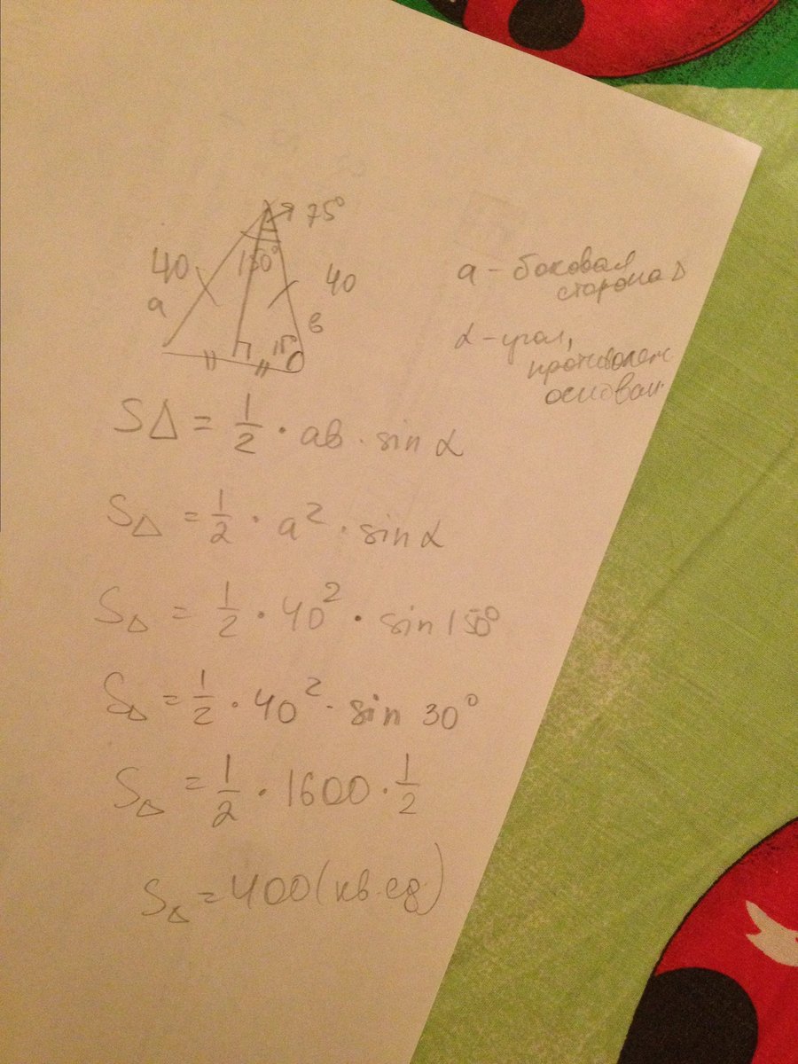 угол при вершине, противолежащий основанию равнобедренного треугольника равен 150*. Боковая сторона треугольника равна 40. Найти площадь треугольника.