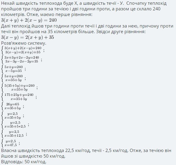 Теплохід пройшов за 3 год за течією і 2 год проти течії 240км.